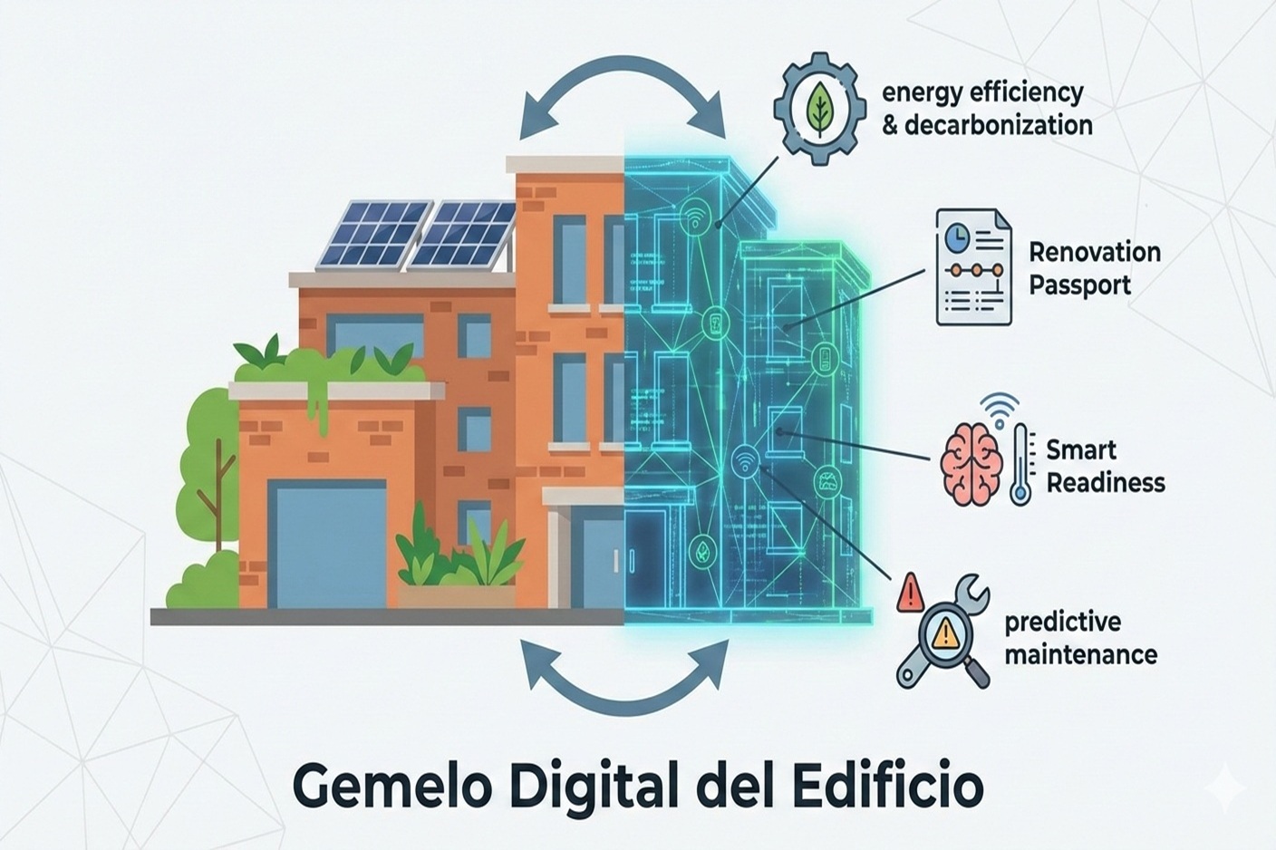 Con la actual Directiva (UE) 2024/1275 se impulsa la digitalización para que los edificios dejen de ser elementos pasivos y pasen a ser nodos inteligentes coordinados con la red eléctrica. El uso del gemelo digital, bajo el paraguas de la Directiva, tiene dos objetivos fundamentales. Por un lado, garantizar que los edificios nuevos, a partir de 2028 para los públicos y 2030 para todos, cumplan estrictamente con las emisiones nulas. Por otro, que los propietarios y gestores tengan información sobre el consumo y el potencial de calentamiento global durante todo el ciclo de vida del edificio.